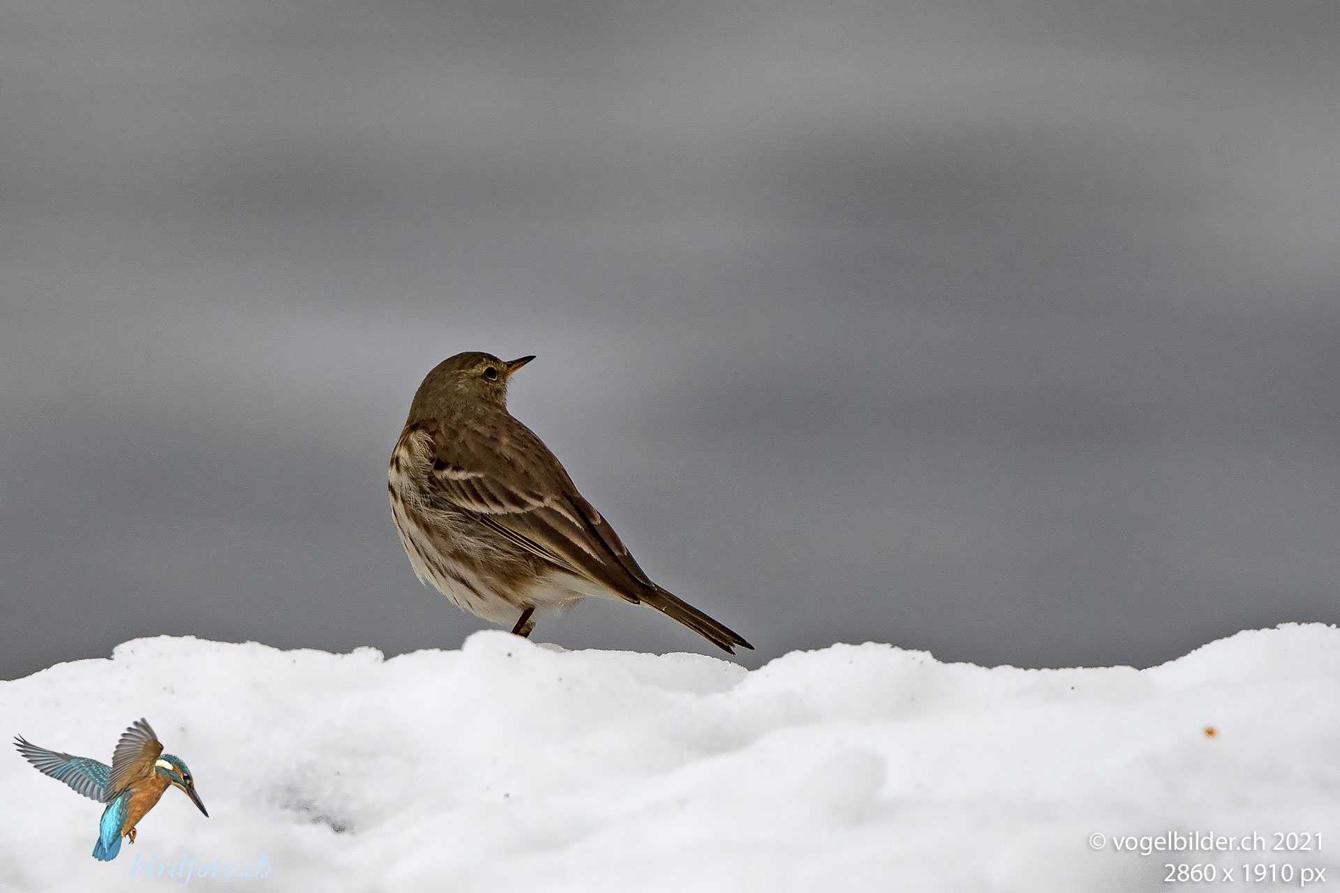 Entlang der Limmat suchen die Bergpieper mit Vorliebe auf dem Schnee nach Nahrung. Sie sind sehr scheu.