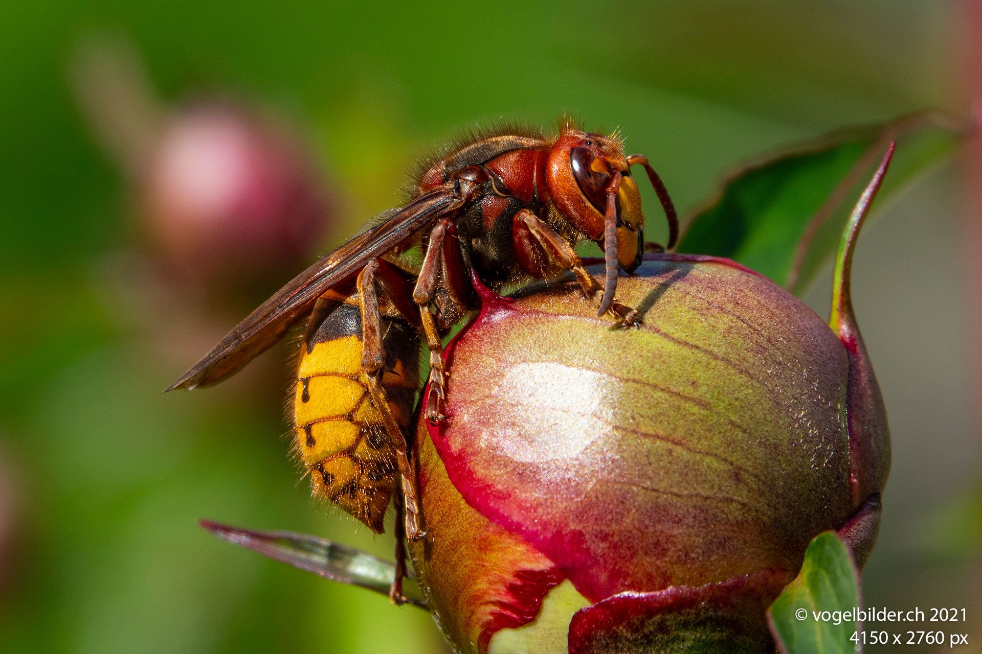 Einmal, an einem kühlen Morgen, sass eine Hornisse auf einer Pfingstrose, wahrscheinlich verköstigte sie sich am austretenden Saft, der auch andere Insekten anzog.