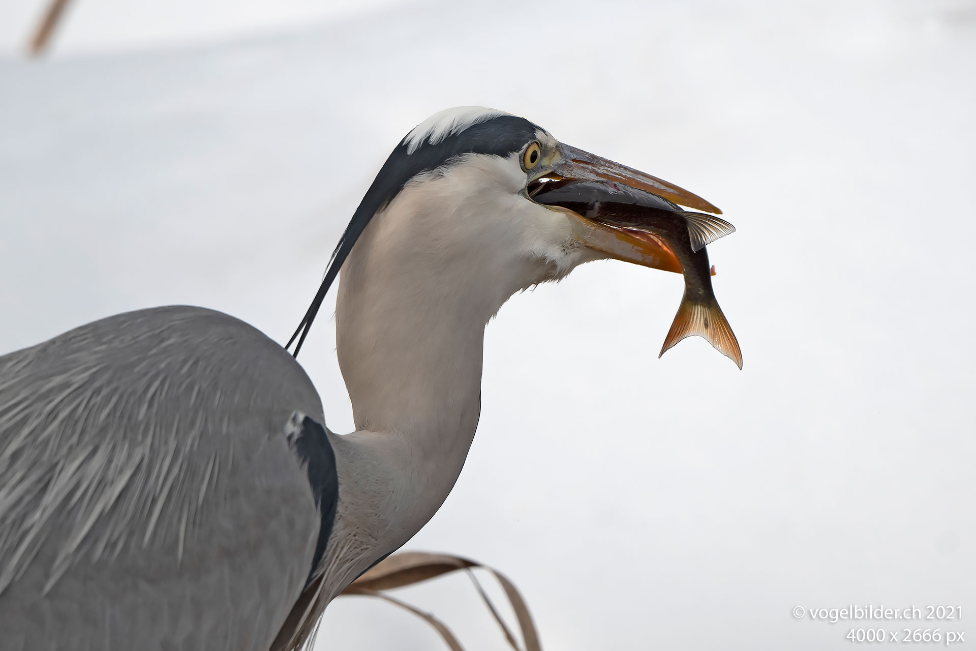 Reiher mit Fisch (21.1.21) sowie Zilpzalp und Baumpieper im Schnee