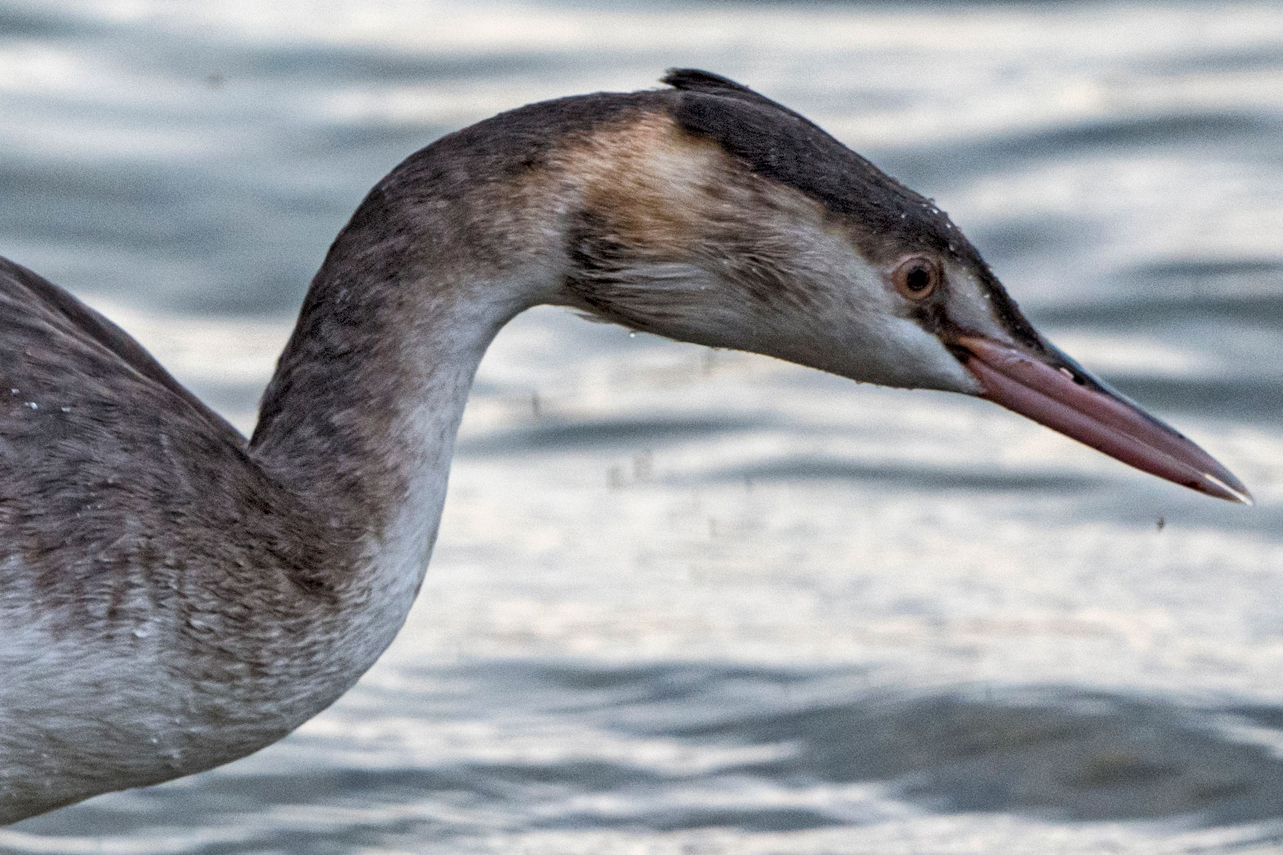 Haubentaucher, Ausschnitt, ohne Konverter. Hier fehlt mir das letzte Quentchen Schärfe. 1:1 Ausschnitt