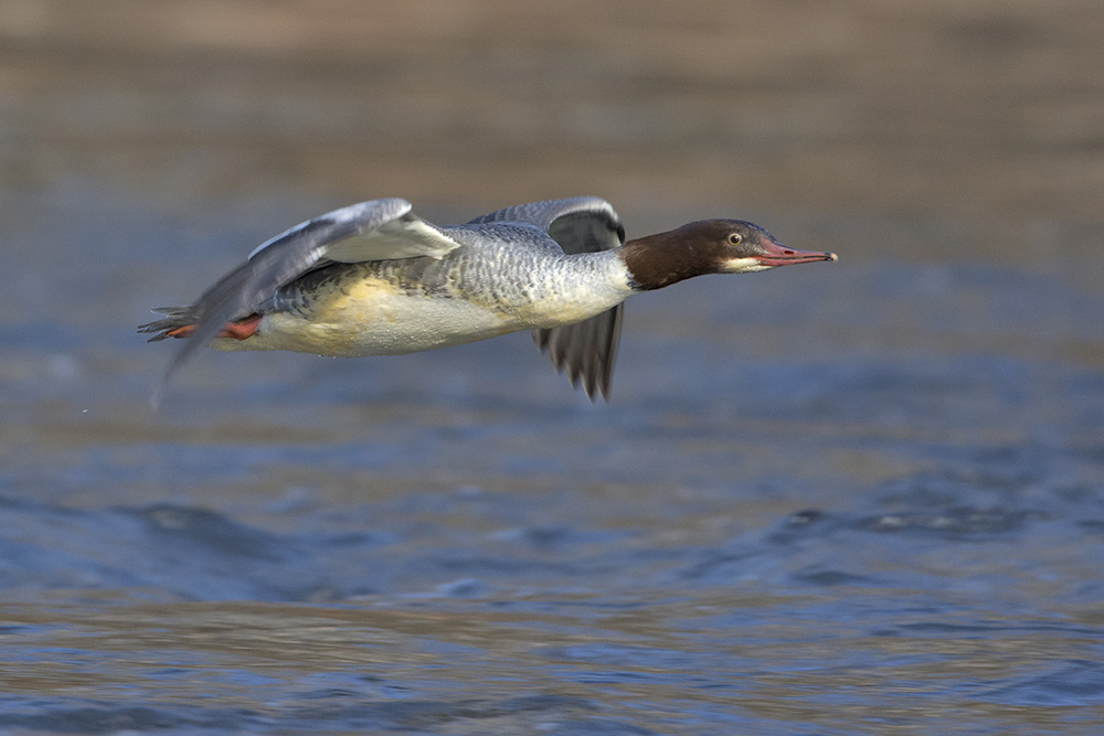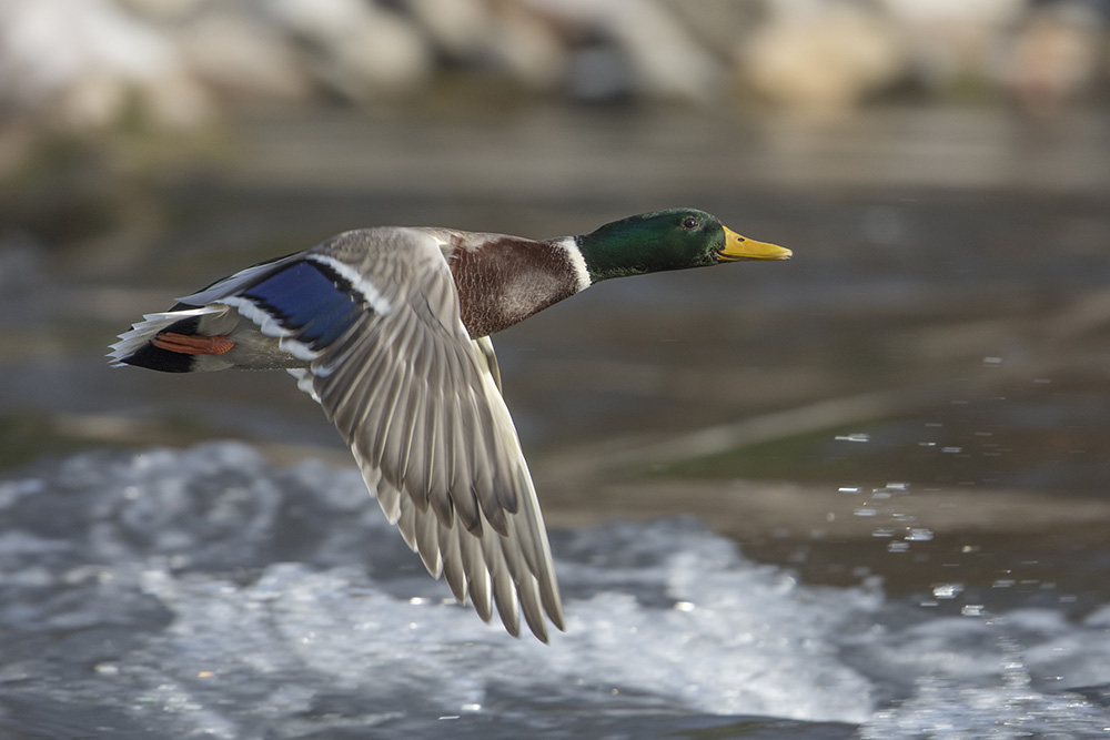 Es geschah nichts. Die Wasseramsel war irgendwo, nur nicht hier. Zum Zeitvertreib versuchte ich fliegende Stockenten und Gänsesäger zu knipsen.