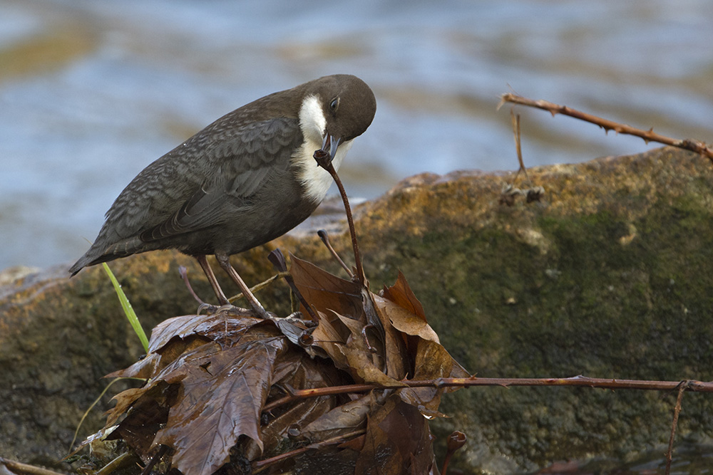 Dann, nach gut 1.5 Stunden, sah ich weit weg eine Wasseramsel. Vielleicht kommt sie ja näher, dachte ich. Das war aber nicht in ihrem Sinn, bis ein Hund dafür sorgte, dass sie aufschreckte. Sie flog in einem Bogen auf die Limmat hinaus und dann gleich wieder aufs Ufer zu, genau in meine Richtung. Der Stein, der rund vier Meter vor meinem Versteck lag, schien ihr Ziel. Doch sie realisierte dann doch noch, dass hier etwas nicht ganz koscher war und drehte wieder ab, um auf dem anderen Ufer zu landen. So gab ich mein Versteck auf. Kurze Zeit später entdeckte ich sie wieder, auf meiner Seite der Limmat. Sie war mit Körperpflege und Singen beschäftigt. Nun schlich ich mich an, Knieschritt für Knieschritt, und sie liess sich nicht stören, aber ablichten.