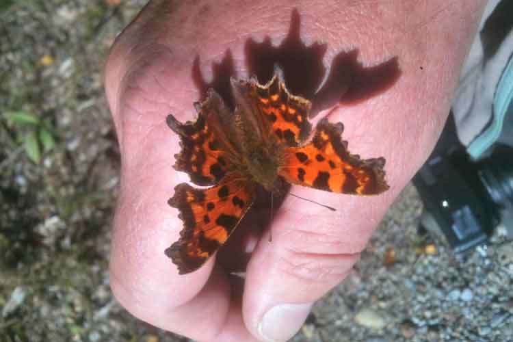 Für einmal erkundete ich ein wenig bekanntes Gebiet im Zürcher Oberland. Nach einem Steinadler in unendlicher Entfernung war lange nichts los. Da flatterte ein Schmetterling an mir vorbei und landete auf dem Boden. Es war nicht, wie zuerst erwartete, ein kleiner Fuchs, sondern ein C-Falter. Deshalb machte ich meinen Fotoapparat bereit, allerdings zu spät, denn er flog sogleich wieder auf. Er umkreiste mich ein paar Mal, und landete dann auf meiner Hose. Das war zwar hübsch anzusehen, aber nach einiger Zeit verscheuchte ich ihn von dort. Er flatterte weiter rund um mich herum, und sein nächstes Landeziel war auf meiner Jacke, direkt beim Handgelenk. Ich konnte ihn wunderschön anschauen, hätte ihn aber gerne porträtiert. Da erinnerte ich mich an die iPhone-Kamera in meiner linken Hosentasche. Zu der hatte ich Zugriff. Allerdings war das ein riskantes Unterfangen, denn die Handy-Kamera hatte ich noch kaum je benützt. So probierte ich einfach einmal, die Ergebnisse waren aber zunächst unbrauchbar. denn das einhändige Bedienen dieses Werkzeugs war nicht ganz einfach. Als der Falter plötzlich losflog, löste sich das Problem nur vermeintlich, denn alsbald setzte er zu einer weiteren Landung an, wozu er meinen rechten Handrücken auserkor. Hier gefiel es ihm ausnehmend gut, offenbar hatte der Schweiss den richtigen Salzgehalt. Nun drückte ich einfach ein paar Mal ab und hoffte auf ein anständiges Selfie.