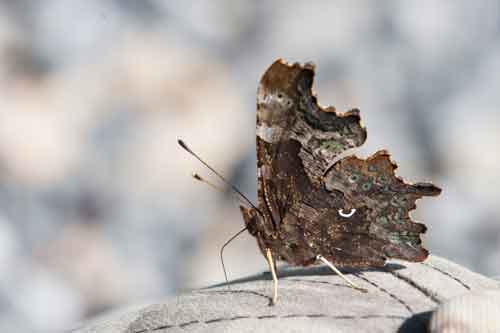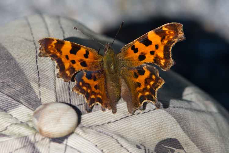 Auf dem Rückweg nahm es mich Wunder, ob er sich noch immer in der Gegend aufhielt, und siehe da, kaum war ich still gestanden, umflatterte mich der C-Falter, und setzte sich - wie ich glaubte - auf meine Mütze. Sorgfältig nahm ich sie vom Kopf, und tatsächlich: Der Falter sass darauf und genoss die Überreste aller bisherigen Schweissausbrüche. Als ich die Mütze auf den Boden gelegt hatte - er blieb schön brav sitzen, konnte ich noch einige Fotos schiessen, und dann hatte auch der C-Falter genug und flog weg.