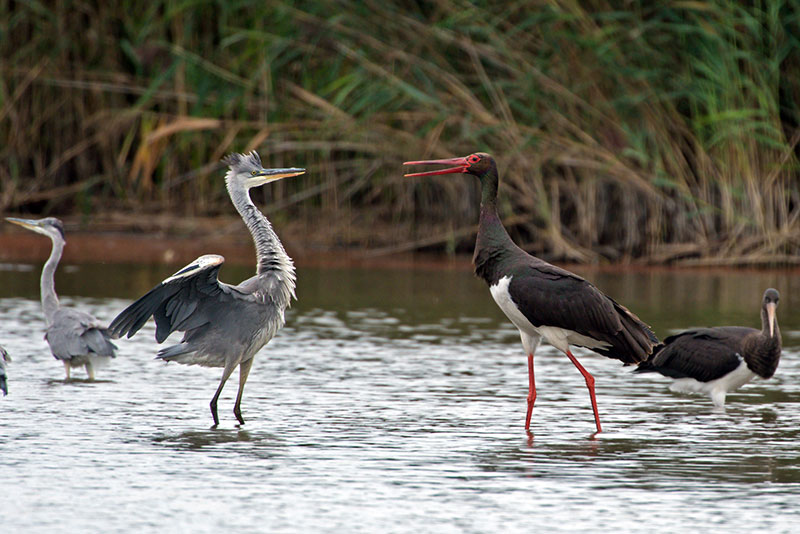 Gleich drei Schwarzstörche - ein Altvogel und zwei Jungvögel - verweilten heute morgen im Neeracherried. Sie standen gelangweilt herum, stocherten gelegentlich im seichten Wasser, hüpften mit den Graureihern um die Wette und der Altvogel begann auch Händel mit einem Eingesessenen. Etwa um halb 12 flogen sie von dannen.