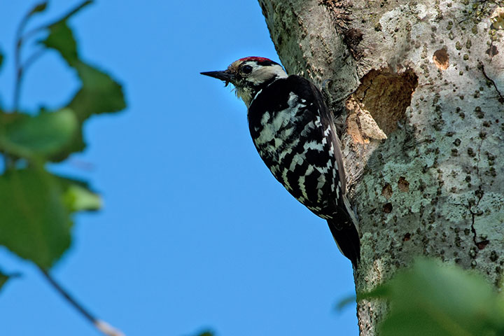 Das Kleinspechtmännchen brachte fleissig Futter für die Jungen, welche noch nicht befiedert sind, aber trotzdem schon den Kopf halb zur Höhle hinaushalten.
