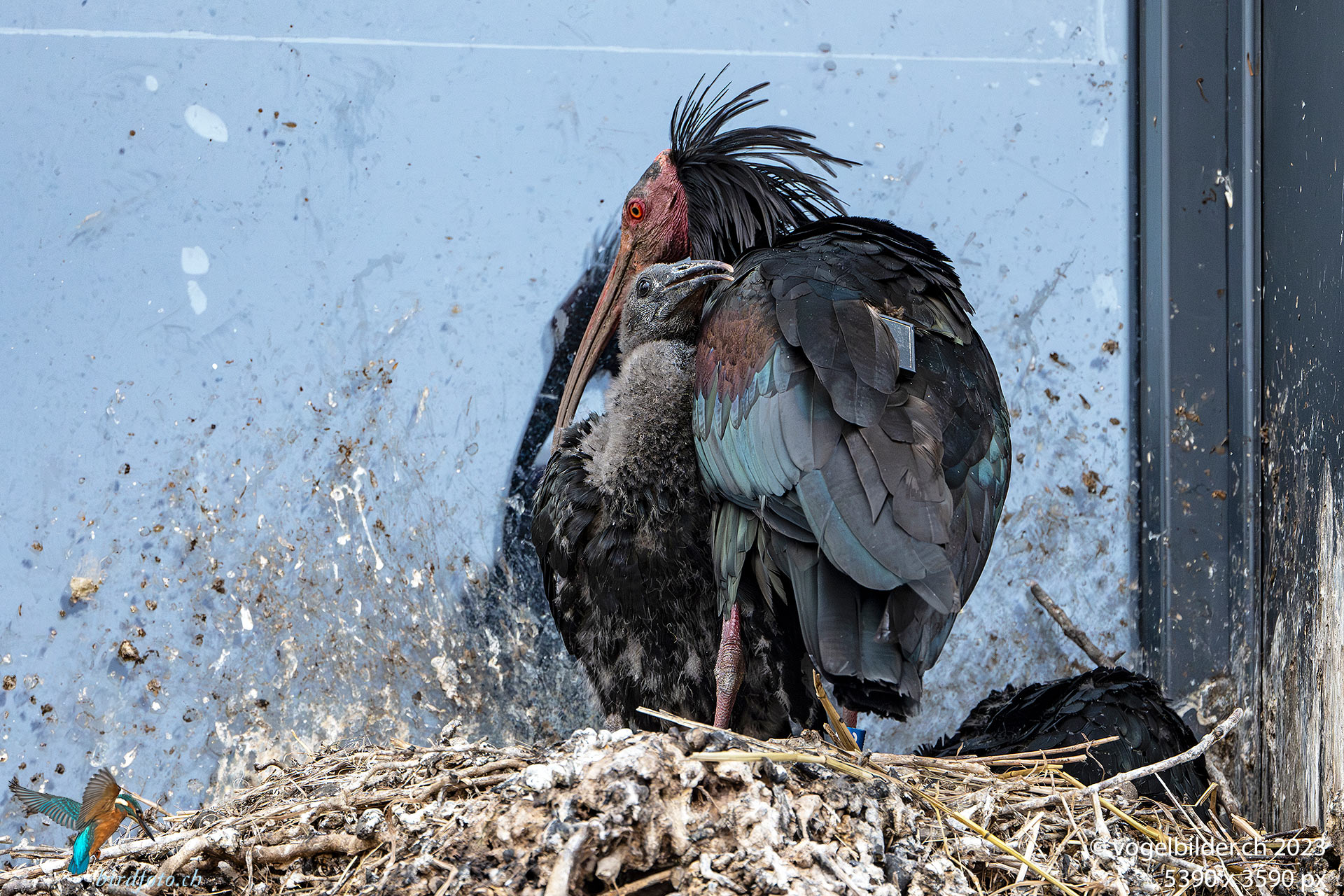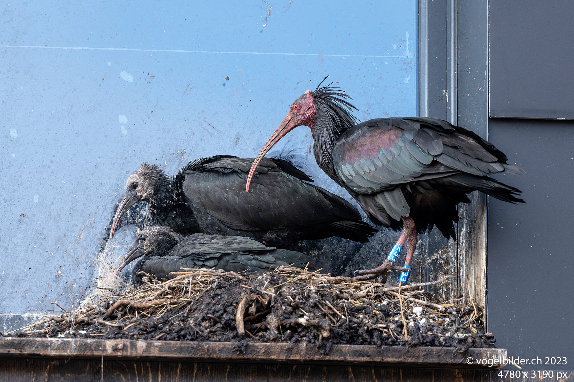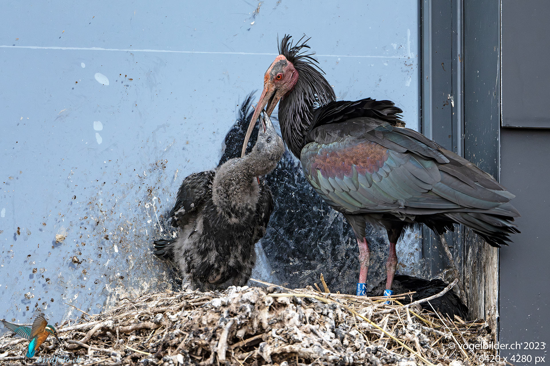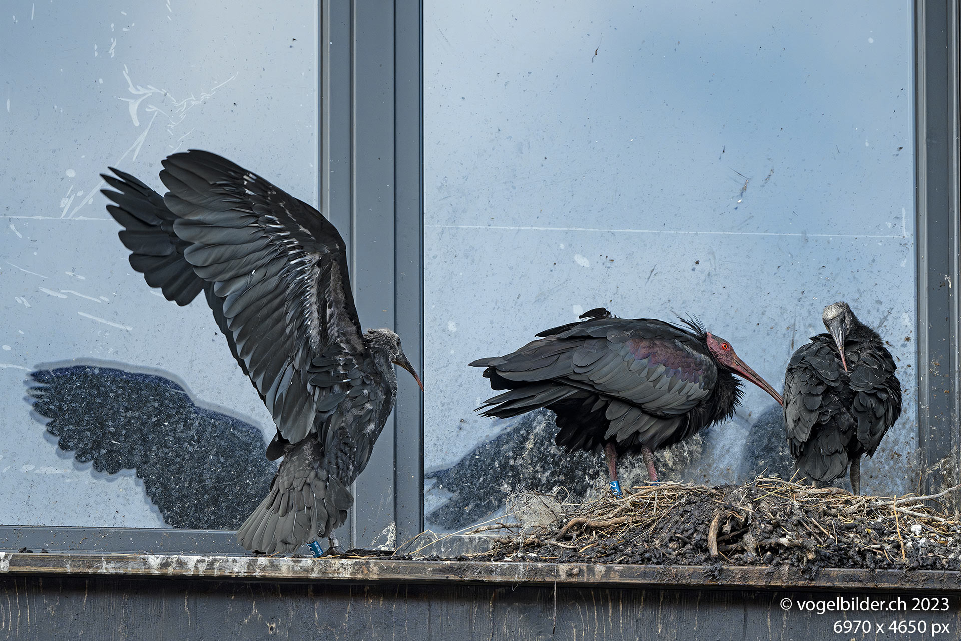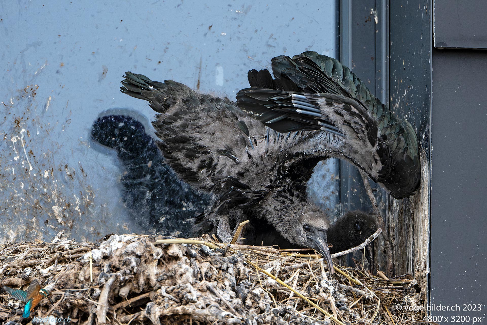 Die beiden Jungen sind beringt und beinahe vollständig befiedert. Der Vater Enea hat heute morgen betreut und ist zwischendurch kurz weggeflogen, ohne Nahrungssuche.