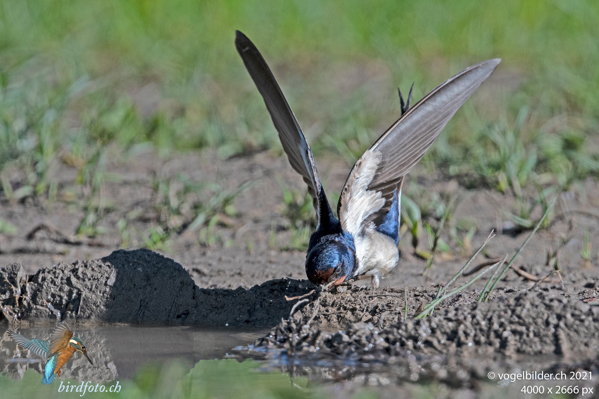 Die Schwalben bauen ihre Nester mit nasser Erde / Lehm. Sie nutzen Karrenspuren nach Regenfall, sind beim Zusammensammeln aber sehr vorsichtig.