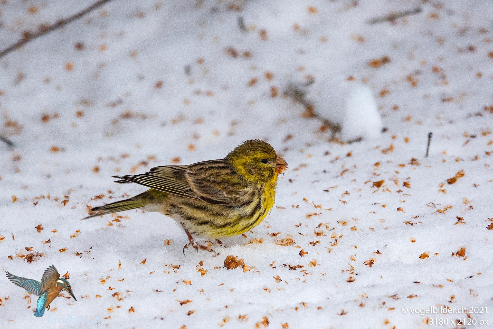 Ein überwinternder Girlitz hat auf der dicken Schneeschicht Nahrung gefunden. Die Erlenzeisige hat er schon vertrieben.